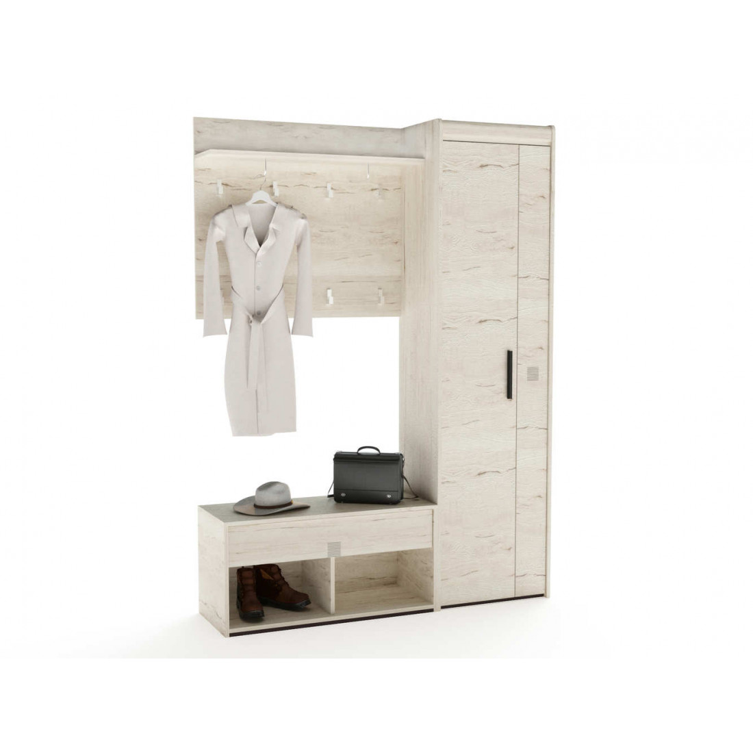 Прихожая «Мале» - обладательница лаконичного и свежего дизайна. Особое внимание привлекают тактильные ощущения от прикосновения к мебели. Декор и структуры, схожие с натуральным деревом по рисунку и шероховатости, придают глубину и естественность. Широкий спектр модулей позволит эргономично использовать Ваше пространство.